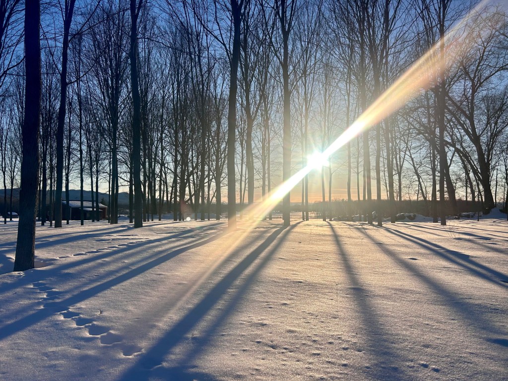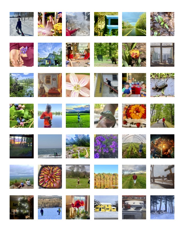 L to R, row 7: Christmas tree *J and E making the monster trek back up the sledding hill * one of the two gift-amaryllises in our kitchen that for whatever reason went off this December. Two rounds of blooming each and a ton of flowers. * House in the two feet of snow we caught this January, still on the ground as I write this. The big stripe of white in the foreground is the snow-cliff cut by the plow * Jordan’s close-up painting of the stovetop * morning appearance of the Snow Moon through the trees *